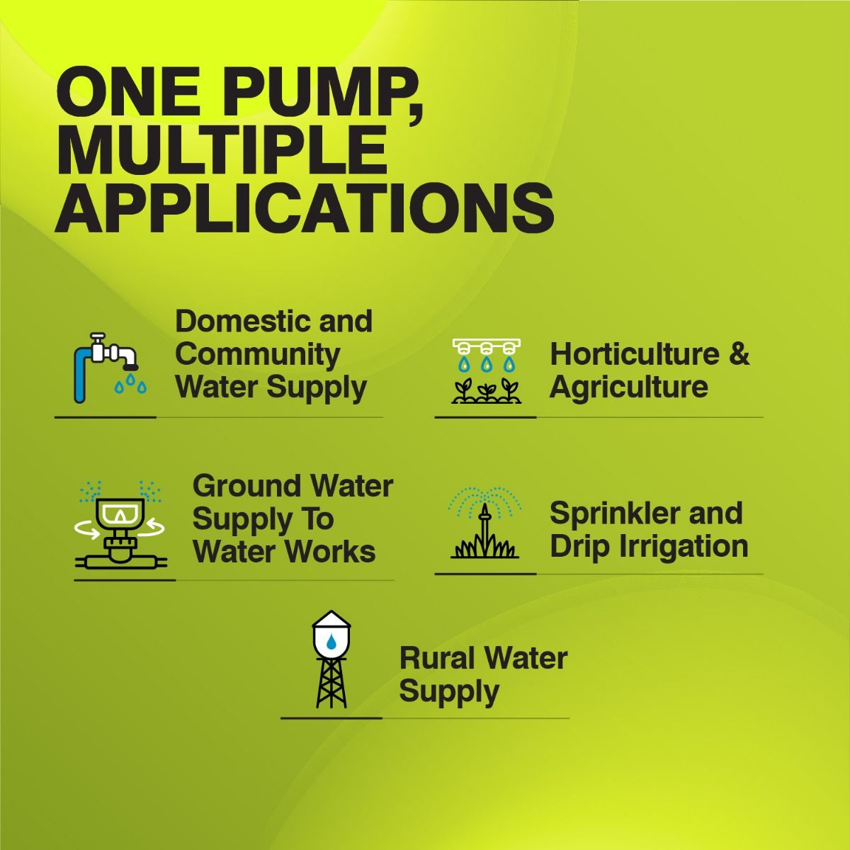Kirloskar Self-priming pump is majorly used for dewatering applications. 15 CM Borewell Submersible 10 hp pump (Three Phase Pump) is widely used for Handling Chemicals, Effluents, Sewage, Ash-water, Dewatering Foundations, Trenches and Pits, Flood Water Handling, Pumping Water from Docks, Ports, Vessels, Dewatering from Basements, Multi-storeys, Shopping Malls, Godowns, Cooling Water for Marine Engines and Shovels. Self Priming - No need for foot valve and priming pumps every time for quicker operations Non-Clog Impeller - Nonclog impeller to handle suspended soft solids up to 60 MM in size made it suitable for sewage and dewatering applications Flatter Efficiency Curve - Minimum variations in efficiency during the entire operating range increase the utility of pump set for variable conditions Designed to Prevent Overloading - Lesser chances of motor burning as it does not get overloaded even if the pump is operated at a head lower than recommended, thus ensuring substantial cost savings due to low maintenance and breakdown Dynamically Balanced Rotating Parts - Minimum vibrations protect components from damage during operation, resulting in consistent performance as concentricity is maintained Replaceable Wearing Parts - All wearing parts within the pumps are easily accessible and replaceable which facilitates ease of maintenance thereby extending the life of the pump Easy Maintainable Designs - Easily maintainable design and better interchangeability of components so that pump can be serviced even at remote locations by semi-skilled technicians