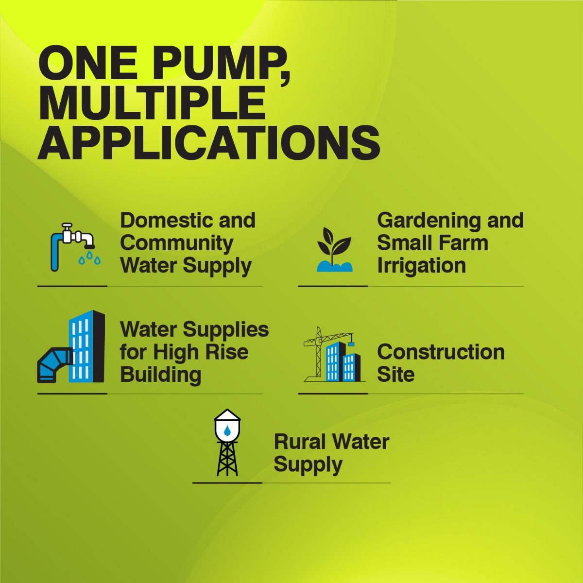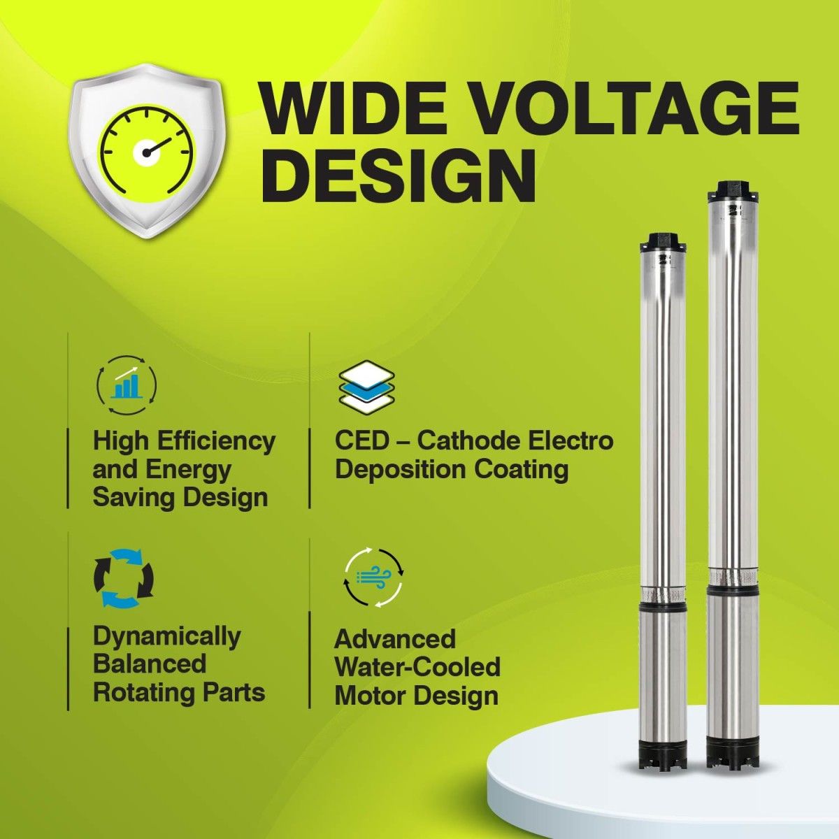 Kirloskar single phase 1 Hp borewell submersible Pump (WATER FILLED) with stainless steel construction, corrosion & abrasion resistant parts. These domestic borewell pumps are ideal for rural water supply, gardening, small farm irrigation, domestic and community supply. The submersible pump has a wide voltage range, compact design, and is used in construction sites too. Key Features High Efficiency & Energy Saving Design - higher output at lesser operating cost and longer life Design to Prevent Overloading - protects from overloading & trouble free operations for the years Wide Voltage Design - best for low voltage applications with capacity to operate from 160 to 240 volts in 1 Phase Advance Water Cooled Motor Designs- protects from overloading & trouble free operations for the years Motors with “B” Class Insulation - made for continuous run and lesser chances of motor burning CED Coating - provides 5 times more protection from corrosion over conventional painting
