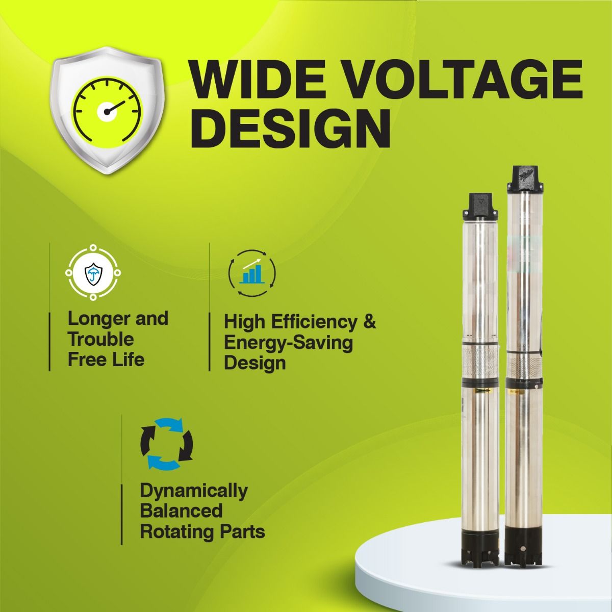 10 CM Borewell submersible Pump(water filled) sets, with their stainless steel construction, corrosion & abrasion resistant parts, and high discharge capacity, ideal for Domestic and Community Water Supply, Rural Water Supply, Gardening and Small Farm Irrigation, Construction Site, Water Supplies for High Rise Building. The sturdy build and high-efficiency design of these pumps are hallmarks of their long life and assured performance. Wide Voltage Motor Designs - The Motor are designed to withstand wide voltage fluctuations from 180 to 240 Volts and reduces motor burning in case of low voltage High Efficiency and Energy saving Design - Higher output, lesser power consumption Dynamically Balanced Rotating Parts - Minimum vibrations protect components from damage during operation, resulting in consistent performance as concentricity is maintained Longer and Trouble-Free Life - High-grade engineering materials like Graded Cast Iron Components, Stainless Steel Shaft, Norly Impellers, Bronze Bushes, Heavy duty Carbon + SS Thrust Plate, 99.9% Electro Grade Copper Rotor and Winding Wires for longer and trouble-free life Advanced Water Cooled Motors Designs - The motor is filled with portable water, protects from overheating, and facilitates smoother and trouble-free operations for the years Sand Fighter designs restrict the entry of sand in motors and protect the pump and motor bushes CED coating - CED is the latest coating technology for corrosion resistance with uniform coating, provides 5 times more protection over conventional painting, resulting in longer life Nationwide Service Network - Easy availability of spares and prompt after services through nationwide company authorized service centers