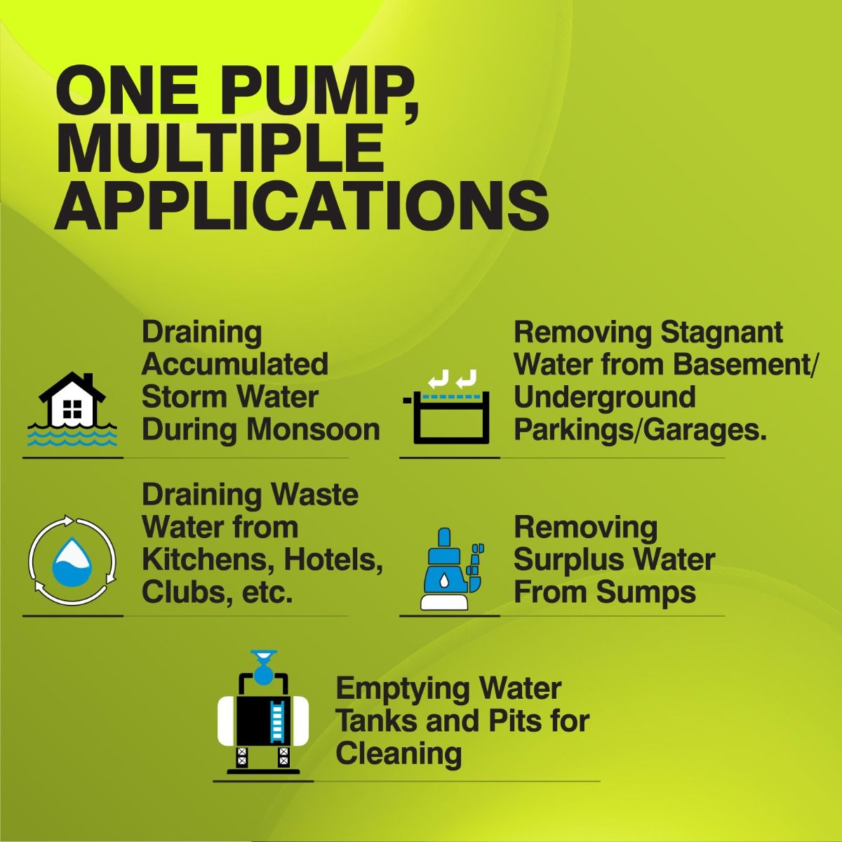 The sewage de-watering submersible pumps are pre-fitted with float switch which ensures that the pump is automatically switched on and off as per requirement. These ready-to-us-pumps don’t require any insulation. Just drop it in the tank and you are ready to go. With a strong stainless steel body and a thermal overload protector, these pumps are suitable for a wide range of dewatering purposes including removing stagnant water from basements, draining accumulated storm water and surplus water from sumps, emptying water-tanks and pits for cleaning, etc. Key Features Corrosion, erosion and rust-free, maintains water hygienic & safe for drinking Suitable for lifting water to greater heights with higher pressure Base support for stability and reduction in noise/vibrant Thermal overload protector to prevent motor burning