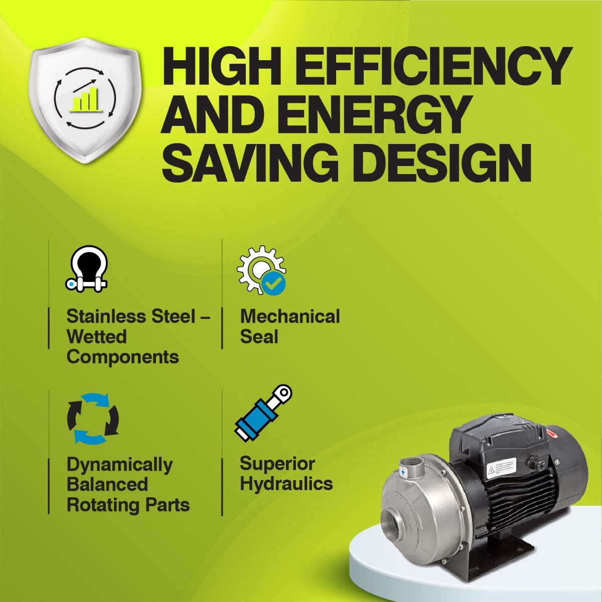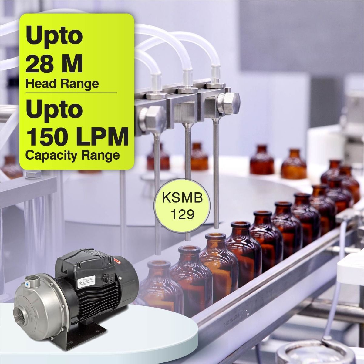 Kirloskar Monoblock Pump KSMB-129 wetted components are made of stainless steel, designed to prevent overloading of the pump if the pump is operated at a head lower than recommended. This Monoblock Water Pump has easy maintainable design and can be easy to service at a remote location by a semi-skilled technician. This water pump has dynamically balanced rotating parts, This pump is widely used for food industries, demineralizing plants, dairy, beverages etc. Key Features This pump has a mechanical seal to ensure no leakage, lower friction loss and protects from wearing shaft Dynamically balanced rotating parts help minimize vibration and protect components from damages Corrosion, erosion and rust-free pump components, best suited for dairy, beverages and food processing industry Design to prevent overloading to operate on the overloaded pump if lower head than recommended