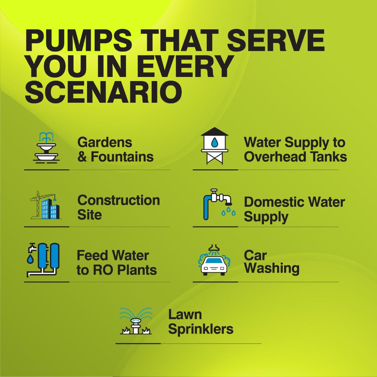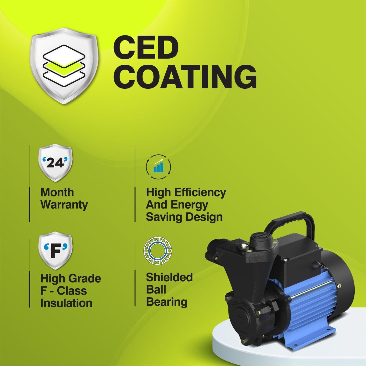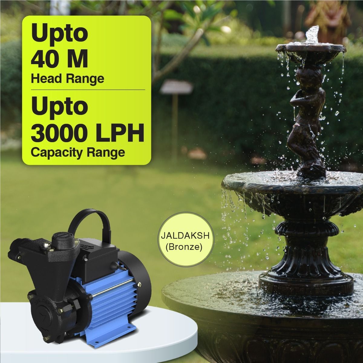 Jaldaksh pumps comprise a thermal oveload protector for protection of motor from overloading. Suitable for the voltage range 180 to 260 volts (Single Phase) and are thus perfectly suited for water supply to over head tanks in bunglows, gardens/ fountains, small farm irrigation, Sumps & water tanks Key Features High efficiency & energy saving design - higher output at lesser operating cost and longer life TOP- Thermal Overload Protector : The pumpset features a Thermal Overload Protector that protects motor from overloading, shielding the motor and associated circuit from the effects of fault current Wide voltage design - capacity to operate from 180 to 260 volts in 1 Phase Shielded Ball Bearings - No external lubrication required through life cycle