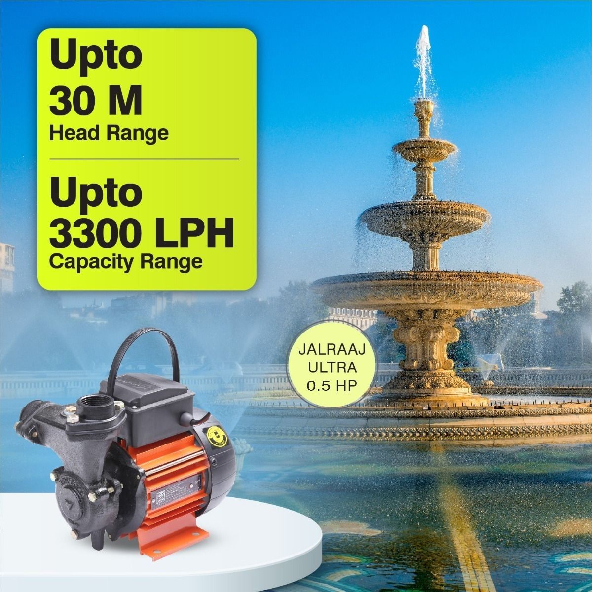 Kirloskar Jalraaj Ultra 0.5 Hp Self-priming pumps feature a Thermal Overload Protector for motor protection from overloading. Suitable for 180 to 260 Volts (Single Phase). For Water supply to overhead tanks in bungalows, Gardens/ fountains, Feed water to RO plants, Domestic water supply, Construction site, Home pressure boosting, Car washing, and Lawn sprinklers. Key Features Shielded Ball Bearings - The low-noise pumps are fitted with shielded ball bearings; so, no external lubrication is required throughout the life cycle High Efficiency and Energy Saving Design - Innovative design manufactured at a state of art, plant ensures optimum efficiency and lower energy consumption resulting in significant cost savings Dynamically Balanced Rotating Parts - Minimum vibrations protect components from damage during operation, resulting in consistent performance as concentration is maintained Easy Maintainable Design - Easily maintainable design and better interchangeability of components so that the pump can be serviced even at remote locations by semi-skilled technicians TOP (Thermal Overload Protector) - The pump set features a Thermal Overload Protector that protects the motor from overloading, shielding the motor and associated circuit from fault current Lightweight and Compact Design - It allows users to carry the pump anywhere easily, adding to its portability and convenience of use High Suction Lift - The pump has a suction lift capacity of up to 7.5 meters with a high head, facilitating the pumping of water at high volumes for a variety of applications High-Quality Aluminum Motor Body - Special grade aluminum motor body provides high resistance to corrosion, better heat dissipation, and lowers the pump's overall weight for enhanced portability Enhanced Safety Features - All electrical parts of the pump are covered, which makes it safer to use Wide Voltage Design - The motor is designed to withstand wide voltage fluctuations ranging from 180 to 260 Volts, thus reducing the possibility of motor burning in case of low voltage