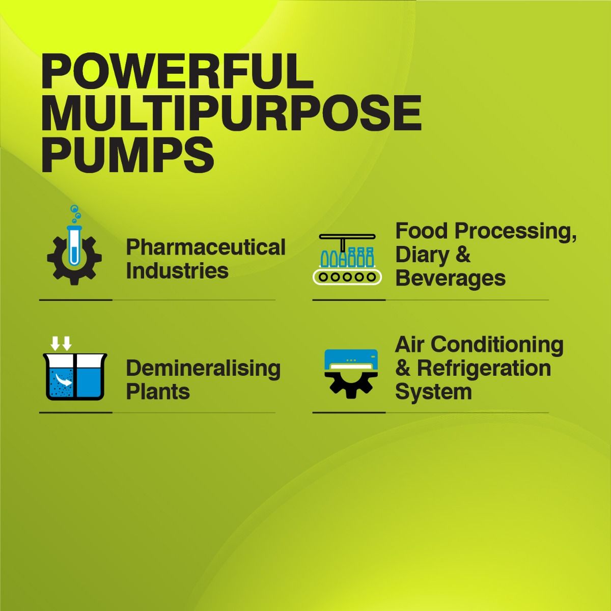 Kirloskar Stainless Steel 7.5 hp Monoblock Pump KSMB 834+ pump with wetted components is made of stainless steel, designed to prevent overloading of the pump if the pump is operated at a head lower than recommended. This Monoblock Water Pump has an easy maintainable design and can be easily serviced at a remote location by a semi-skilled technician. This water pump has dynamically balanced rotating parts, This pump is widely used for pharmaceutical industries, food processing, demineralizing plant, air conditioning and refrigeration systems, dairy and beverages. Features Stainless Steel Components - All wetted components are made of Stainless Steel which makes it suitable for handling various liquids Mechanical Seal - Superior quality of mechanical seal ensures zero leakage, lower friction loss, and protects from wearing of shaft, thus resulting in easy maintenance and longer life High Efficiency and Energy Saving Design - Innovative design manufactured at state of the art plant, delivers optimum efficiency at lower energy consumption resulting in significant cost savings Superior Hydraulics - Superior hydraulics due to advanced manufacturing processes provides efficiency at par with international standard Dynamically Balanced Rotating Parts - Minimum vibration protects components from damage during the operation, thus ensuring consistent performance as concentricity is maintained Lightweight and Compact Design - Constructed with special-grade engineering materials, the pump sports a compact design for ease of handling and installation Easy Maintainable Designs - Easy maintainable design and better interchangeability of components so that pump can be serviced even at remote locations by semi-skilled technicians Designed to Prevent Overloading - Lesser chances of motor burning as it does not get overloaded even if the pump is operated at a head lower than recommended, thus ensuring substantial cost saving due to low maintenance and breakdown