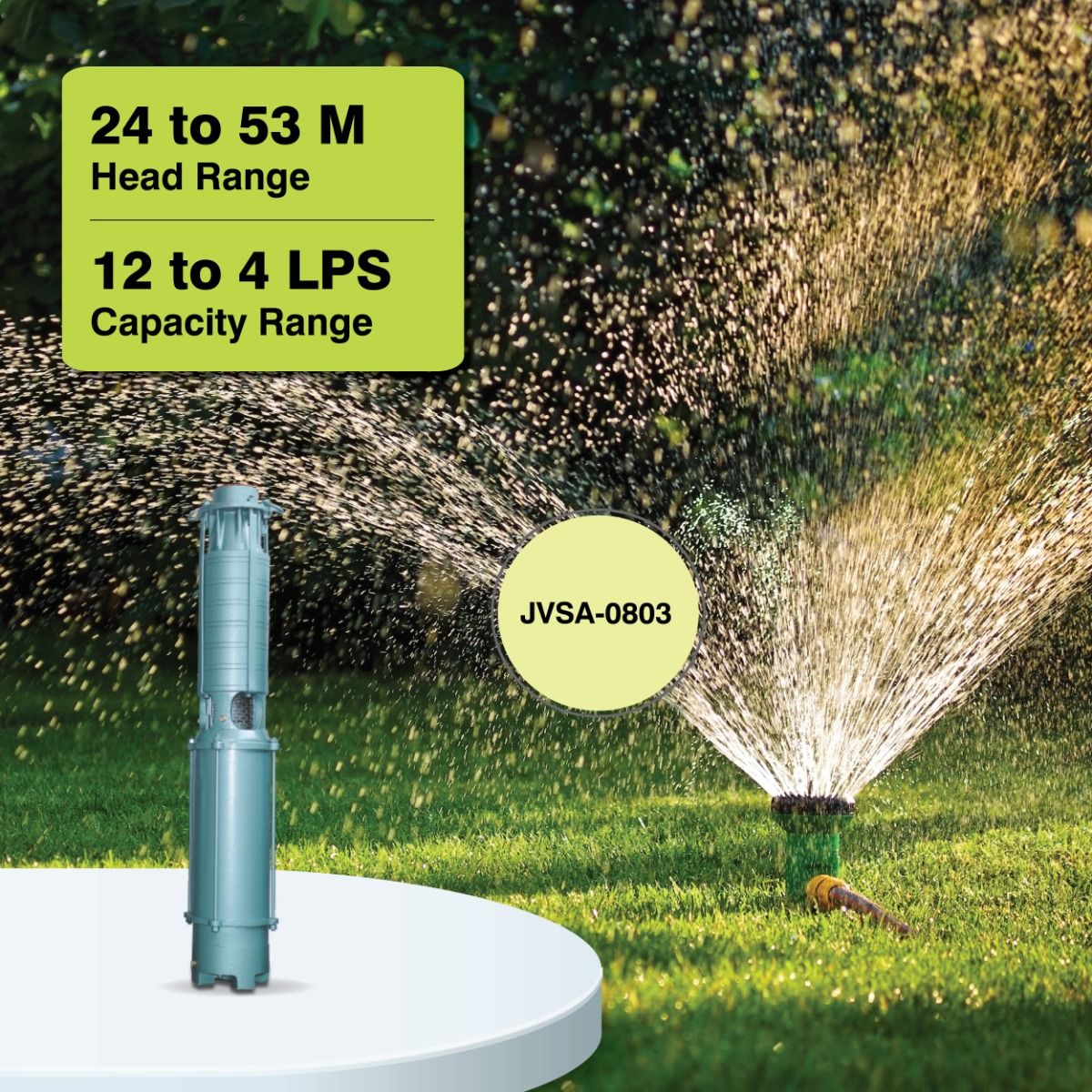 JVSA-0803 Vertical Openwell Submersible Pump, 7.5 HP, Three Phase is designed to withstand wide voltage fluctuations from 200 to 440 Volts and reduces motor burning in case of low voltage. These pumps are suitable for irrigation in horticulture & agriculture, sprinkler and drip irrigation, water supplies for high rise buildings, rural water supply, and domestic and community water supply, etc. Key Features Wide Voltage Design The motor is designed to withstand wide voltage variations which reduces the chances of motor burning at low voltage. Design to Prevent Overloading Lesser chances of motor burning even if the pump operates at lower head than recommended as motor does not get overload thus ensures substantial saving from maintenance cost and breakdown. High Efficiency and Energy Saving Design Innovative design manufactured at state of art plant, delivers optimum efficiency at lower energy consumption resulting in significant cost savings. Dynamically Balanced Rotating Parts Minimum vibration protects components from damage during the operation, thus ensures consistent performance over longer time period as concentricity is maintained. Advanced Water Cooled Motors Designs The motor is filled with potable water, protects from overheating and facilitates smoother and trouble free operation for the years. Wide Voltage Motor Designs Motors are designed with extra overload capacities, more water spaces and engineered with high grade materials to performs well in low voltage with minimum discharge drops and suitable for wide voltage applications. Easy Maintainable Designs Easy maintainable design and better interchangeability of components so that pump can be serviced even at remote locations by semi-skilled technicians. High Head Applications The pump has been designed to deliver large volumes of water for high head applications, helping customers to achieve high turnaround time and productivity